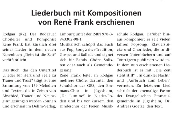 Wochenzeitung "Rodgau Post" am 26.09.2025 zu dem Liederbuch "Dein ist die Zeit":