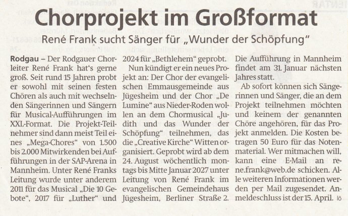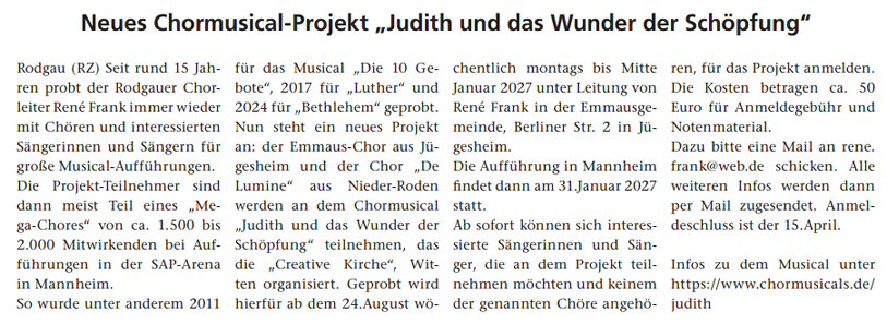 Wochenzeitung "Rodgau Zeitung" am 02.04.2026 über das Musical "Judith und das Wunder der Schöpfung":