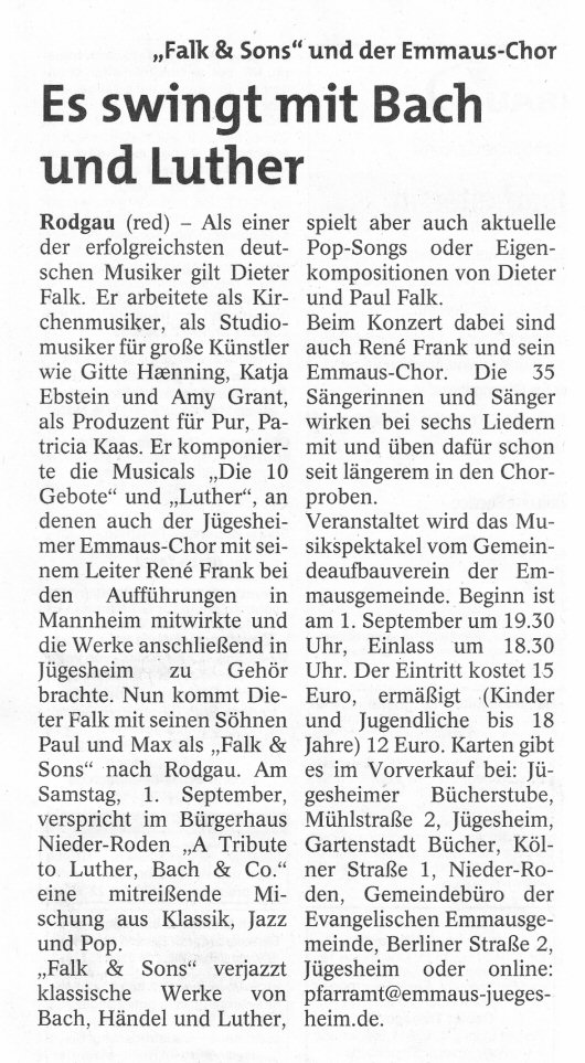 Wochenzeitung "Rodgau Post" am 13.09.2018 über das Konzert "Falk & Sons":