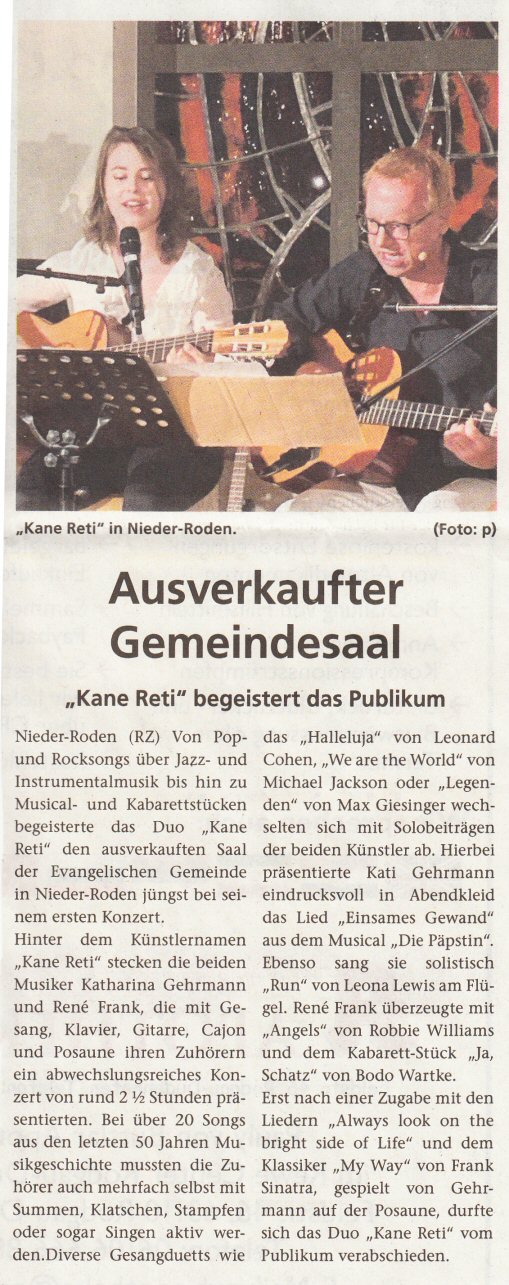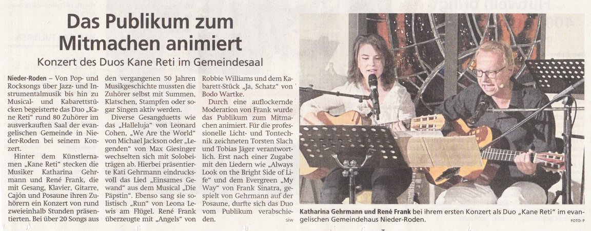 Wochenzeitung "Rodgau-Zeitung" am 29.10.2021 über das Konzert des Duos "Kane Reti" am 09.10.2021: