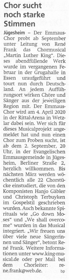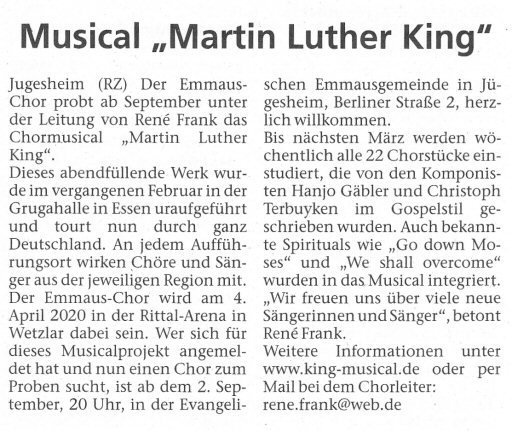 Wochenzeitung "Rodgau Zeitung" am 29.08.2019 über den Probenbeginn für das Chor-Musical "Martin Luther King":