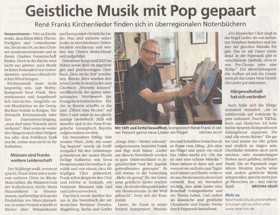Tageszeitung "Offenbach Post" am 15.04.2026 über die Veröffentlichung meiner Chorlieder in mehreren Notenbüchern: