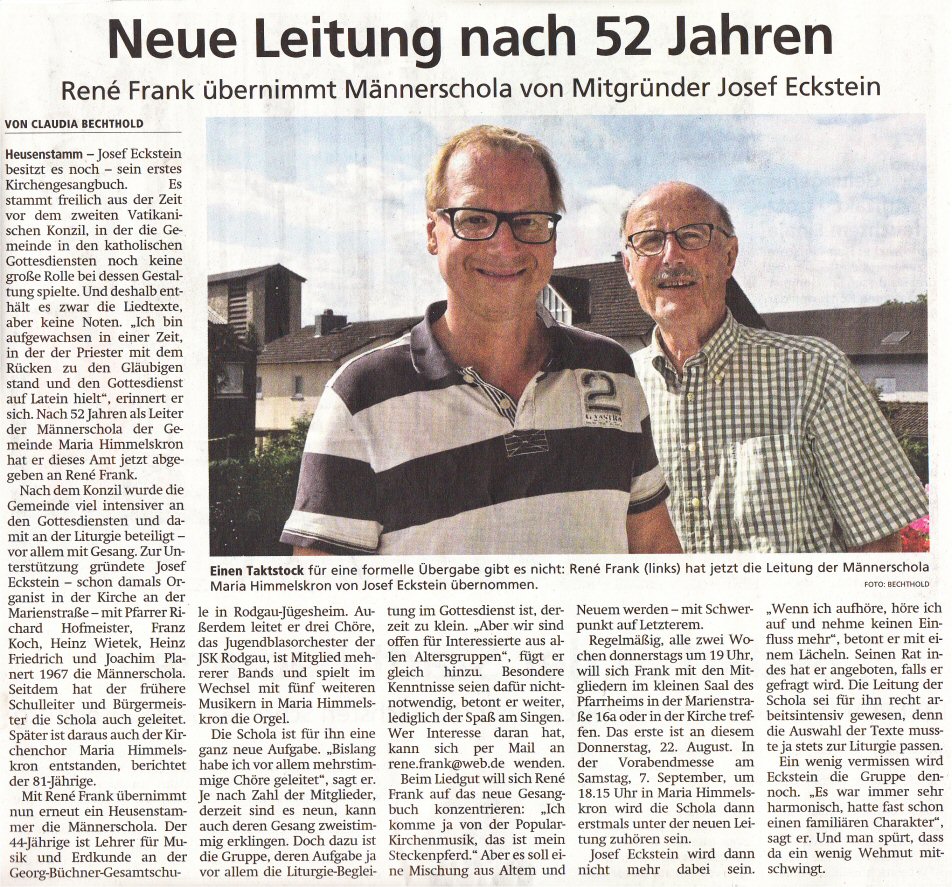 Tageszeitung "Offenbach Post" am 21.08.2019 über die Übernahme der "Männerschola" in Heusenstamm: