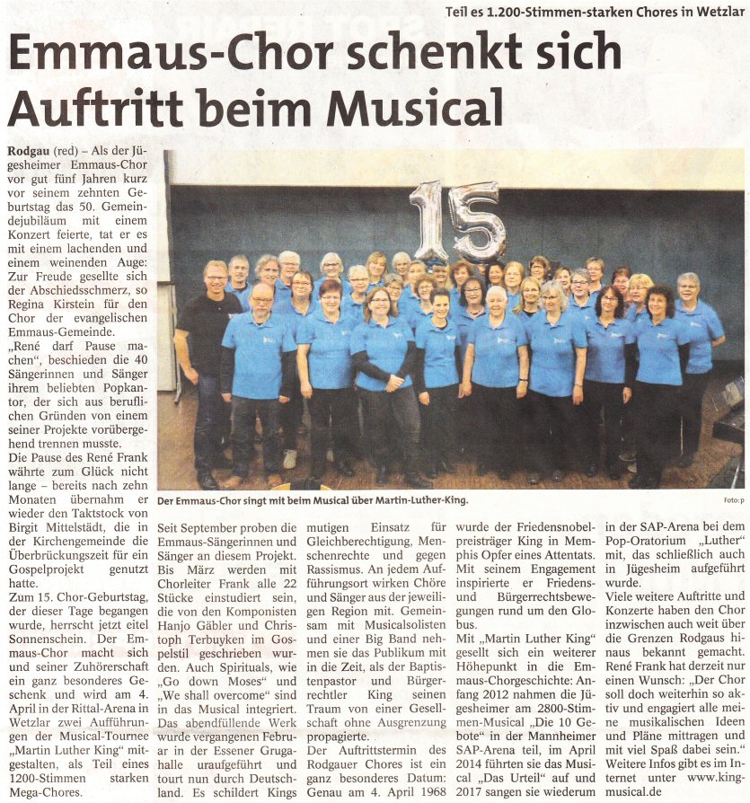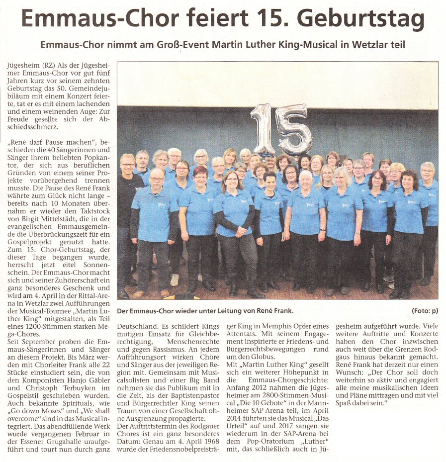 Wochen-Zeitung "Rodgau Post" am 13.02.2020 zum 15-jährigen Jubiläum des "Emmaus-Chores":
