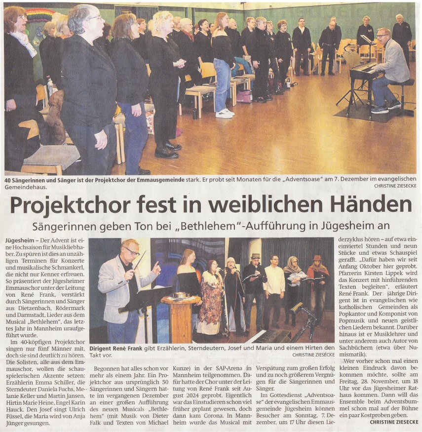 Tageszeitung "Offenbach Post" am 27.11.2025 über Auftritte mit Auszügen aus dem Chormusical "Bethlehem" in Rodgau